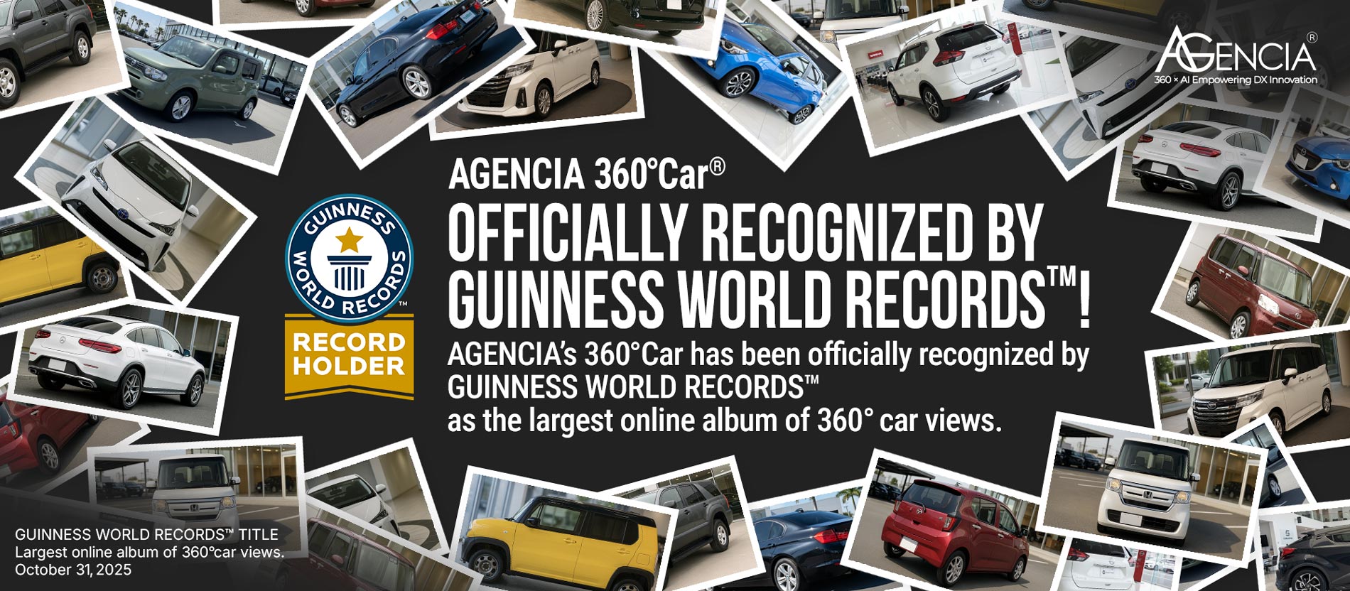 (Head office: Higashi-ku, Nagoya, Aichi; CEO: Jean-Pierre), AGENCIA company that promotes digital transformation (DX) in the automotive industry through AI and 360° photography technology, announced that its SaaS platform " 360°Car " has been officially recognized by Guinness World Records™ as the "Largest online album of 360° car views in the world. The company announced that its SaaS platform, 360°Car®, has been officially recognized by Guinness World Records™ as the "Largest online album of 360° car views".